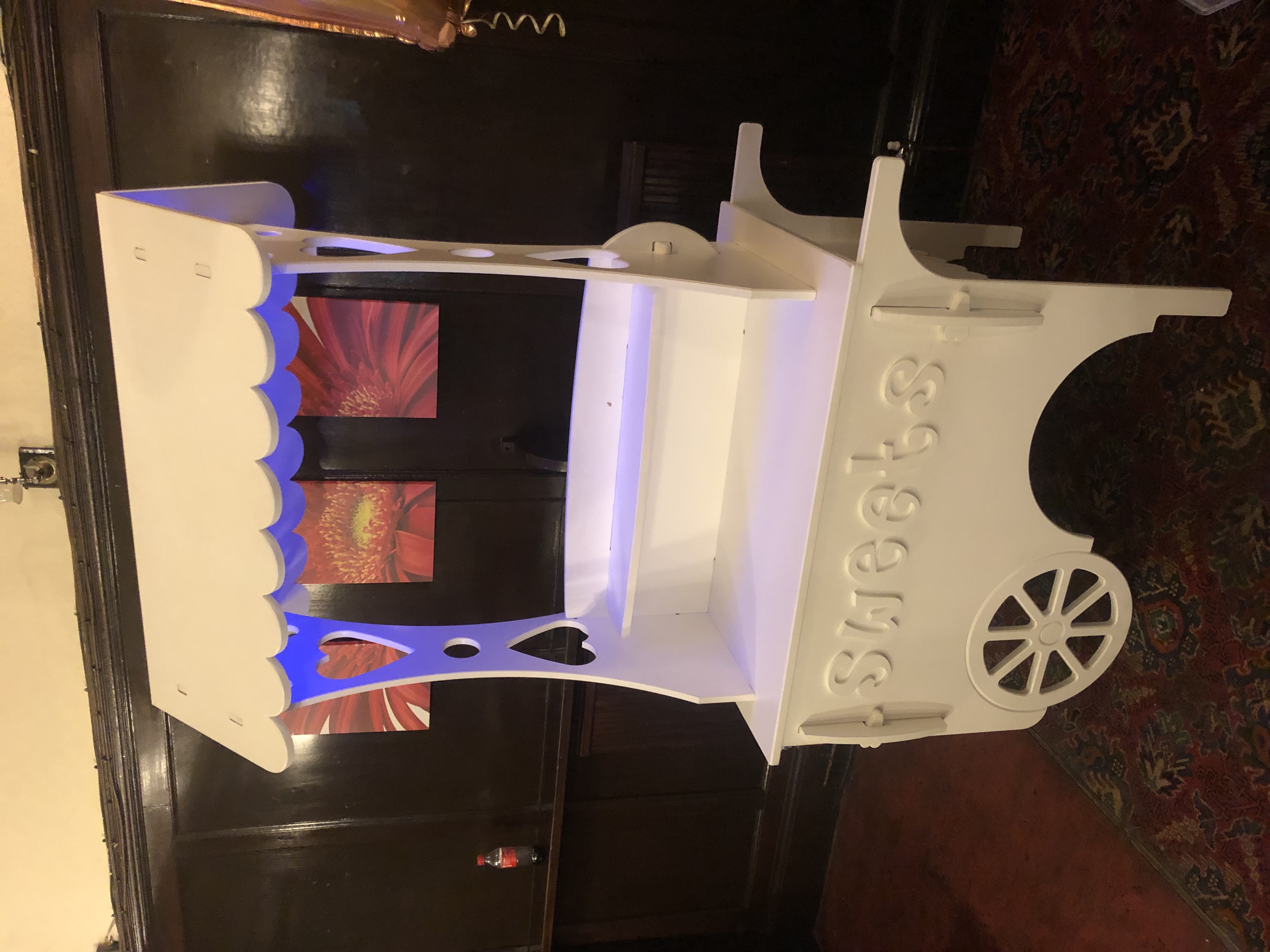 This bright and modern sweet cart will give your party the glow it needs, featuring built in mood lights mounted inside where you can choose from a huge range of colors to enable the cart to light up. This package includes 12 traditional mixed sized glass jars, prongs, scoops and decorations. This sweet cart is great for all occasions birthdays, weddings and christenings. Stocking a huge range of sweets for you to choose SWEETS and coloured BAGS At an additional charge.